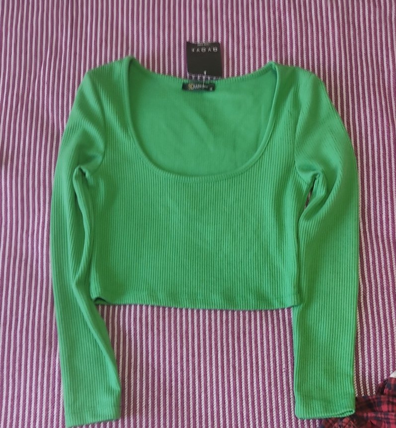 Bu yeşil triko bluz, uzun kollu ve kayık yaka detaylıdır. Yumuşak sentetik kumaştan ve örgü dokusundadır. Pastel tonu ile günlük sokak stiline uygundur.