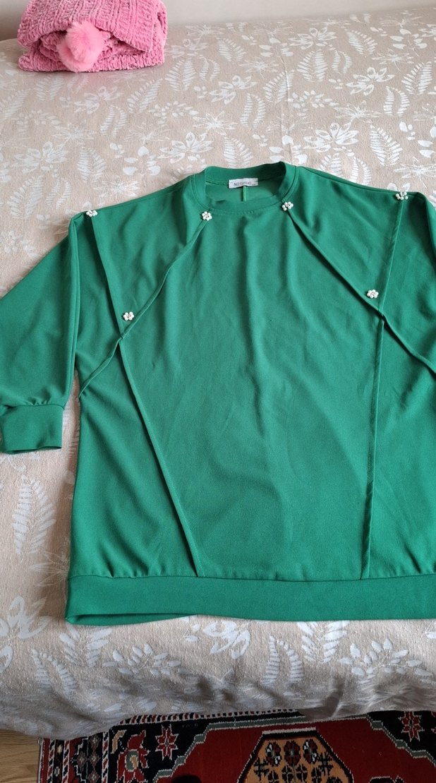 Yeşil renkli kadın tunik yuvarlak yaka, uzun kollu ve bol kesimdir. Omuzlarda düğme detayları bulunur ve yumuşak, sıcak kumaştan yapılmıştır. Parlak rengi ve sade tasarımıyla sokak modasına uygundur.