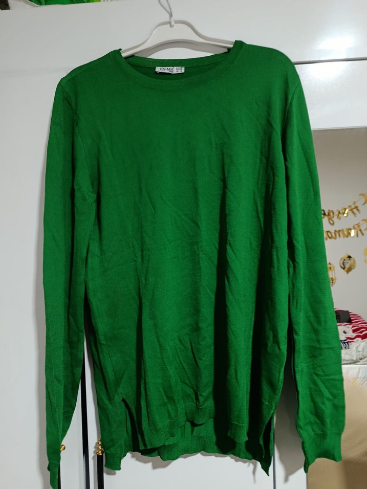 Yeşil renkli, uzun kollu ve yuvarlak yakalı kadın kazak. Pamuklu yumuşak kumaştan, bol kesim ve normal midi boydadır. Günlük kullanım için uygundur.