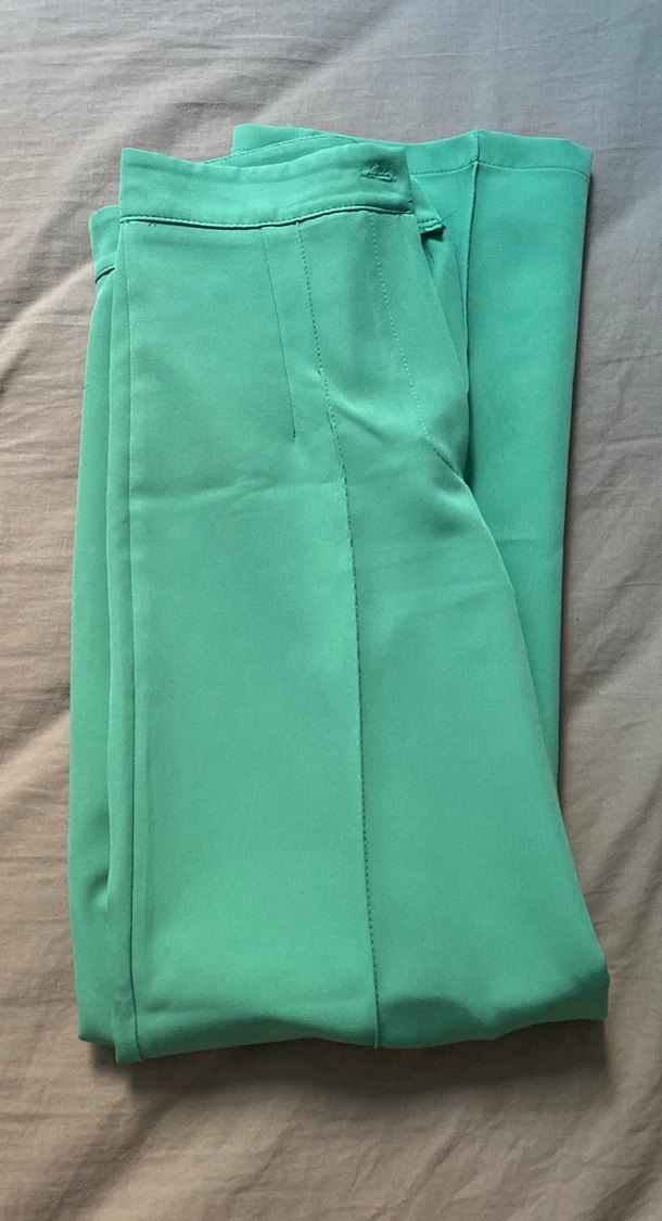 Yesil renkte, düz kesim ve uzun boyda kadın kumaş pantolon. Düz yüzeyli sentetik kumaştan, fermuarlı detaylı, minimalist ve ofis stiline uygun.