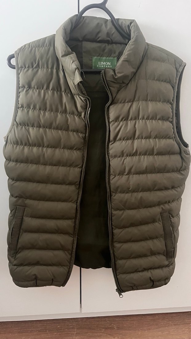 Yeşil renkli, kolsuz uzun şişme yelek yüksek yakalı ve fermuarlı. Sentetik kumaştan üretilmiş, günlük kullanım için uygun, dar kesim ve desensizdir. Marka: Limon.