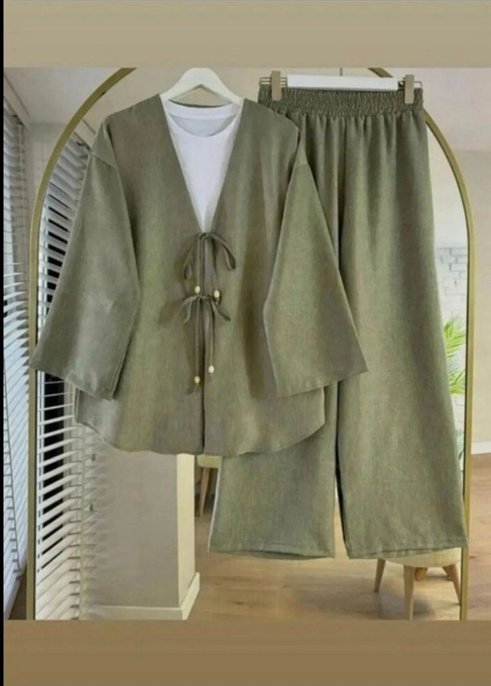 yesil renkte, bol kesim ve uzun boyda, sade desenli kadın kimono. İnce askılı kolları ve ön tarafında bağlama detayları bulunur. ️