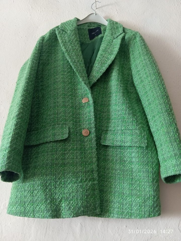 Yeşil yün kumaştan, düğmeli, normal boyda ve uzun kollu, rahat kesim kadın blazer ceket. Sokak stili ve parlak dokusu ile günlük kullanıma uygun.
