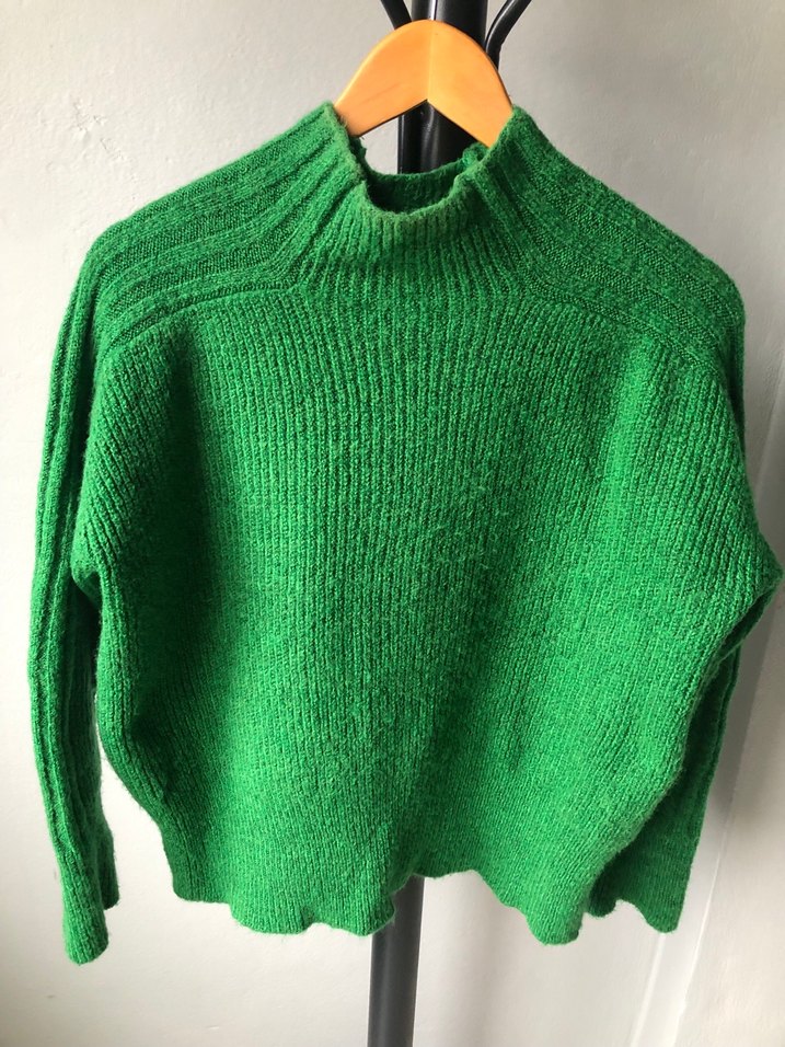 Yeşil renkte, yün örgü dokulu boğazlı ve uzun kollu, bol kesim normal uzunlukta günlük kullanıma uygun rahat bir kazak.