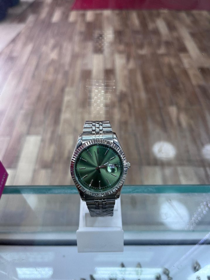 Yeşil kadran ve gümüş metal bilezikli erkek saati, klasik tasarımı çağdaş bir görünümle birleştirir. Canlı yeşil kadran saatin renkli detayını oluşturur. ⌚