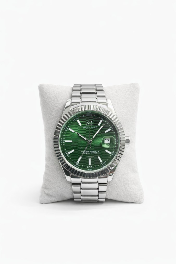 Canlı yeşil kadran ve gümüş metal kayışa sahip erkek saati, klasik ve modern tarzları bir araya getirir. Tarih göstergesi ve dokulu bezel bulunur. ⌚