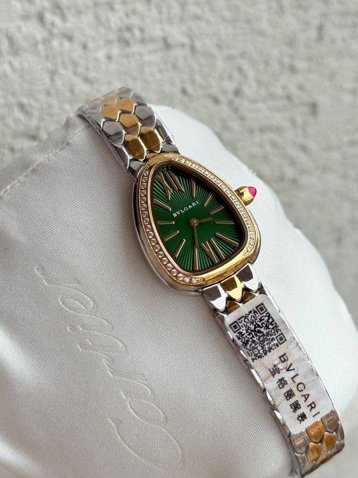 Yeşil kadranlı, tokalı kayışlı kadın saati, klasik zarafeti modern klasik tarzla buluşturuyor. Altın ve gümüş tonlarında, damla şekilli kasa.