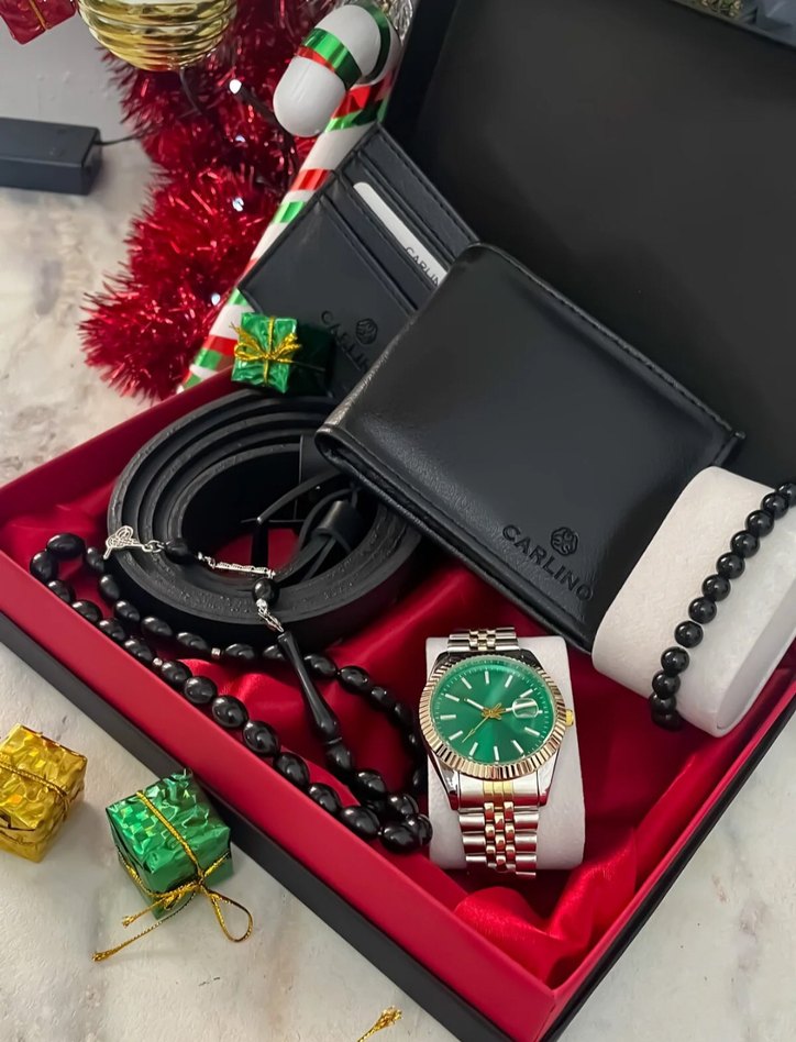 Yeşil kadranlı erkek saati, siyah deri cüzdan, siyah kemer, boncuklu bileklik ve siyah tespih içeren set, kırmızı kaplı kutuda sunuluyor. ⌚