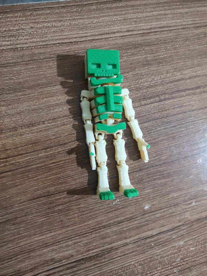 Koyu yeşil ve krem renkli, hareketli eklemlere sahip iskelet aksiyon figürü. 3 d baski