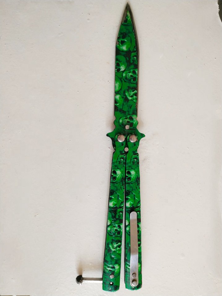 Renkli yeşil kafatası desenli kelebek bıçak, metal klips ile güvenli tutuş sağlar. ️