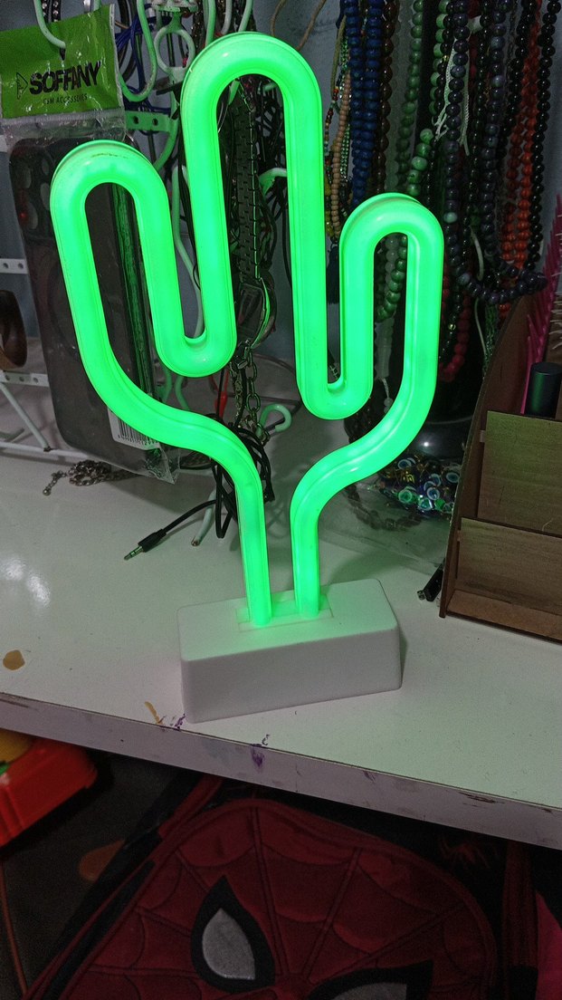 Yeşil neon ışıklı, kaktüs şeklinde ve beyaz tabanlı renkli bir lamba.