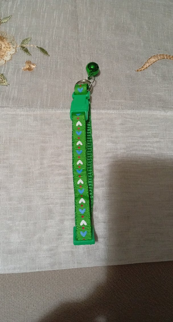 Renkli kalp desenli yeşil kedi tasması, küçük zil ve ayarlanabilir tokalıdır.