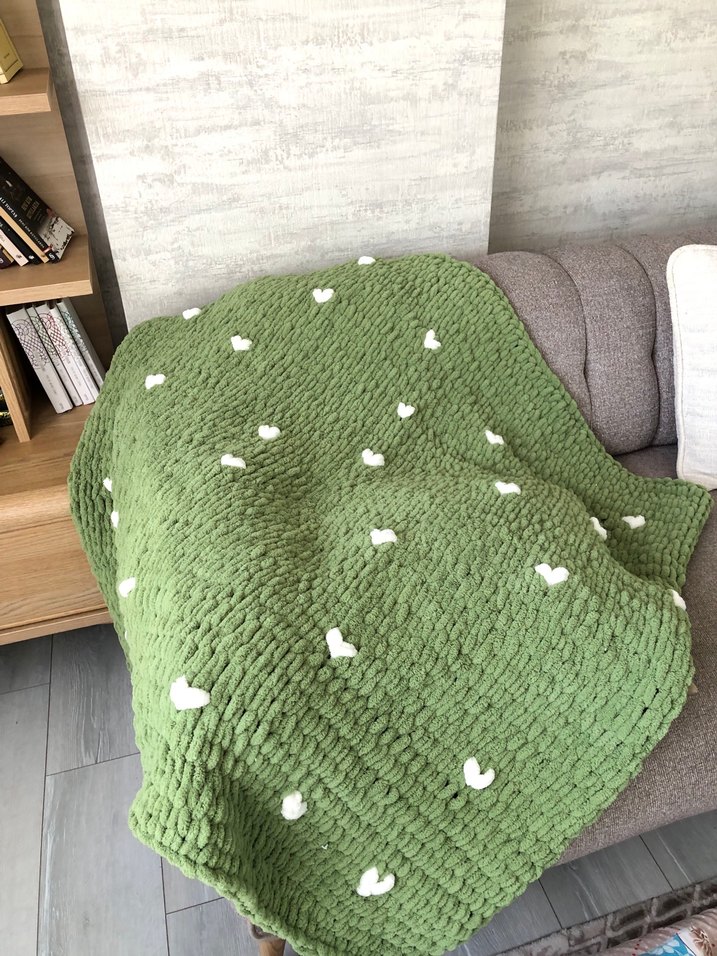 Pastel yeşil renkte, küçük beyaz kalp desenli yumuşak ve rahat örgü battaniye, sıcaklık ve şıklık katmak için uygun. Tv battaniyesi olarak da kullanabilirsiniz