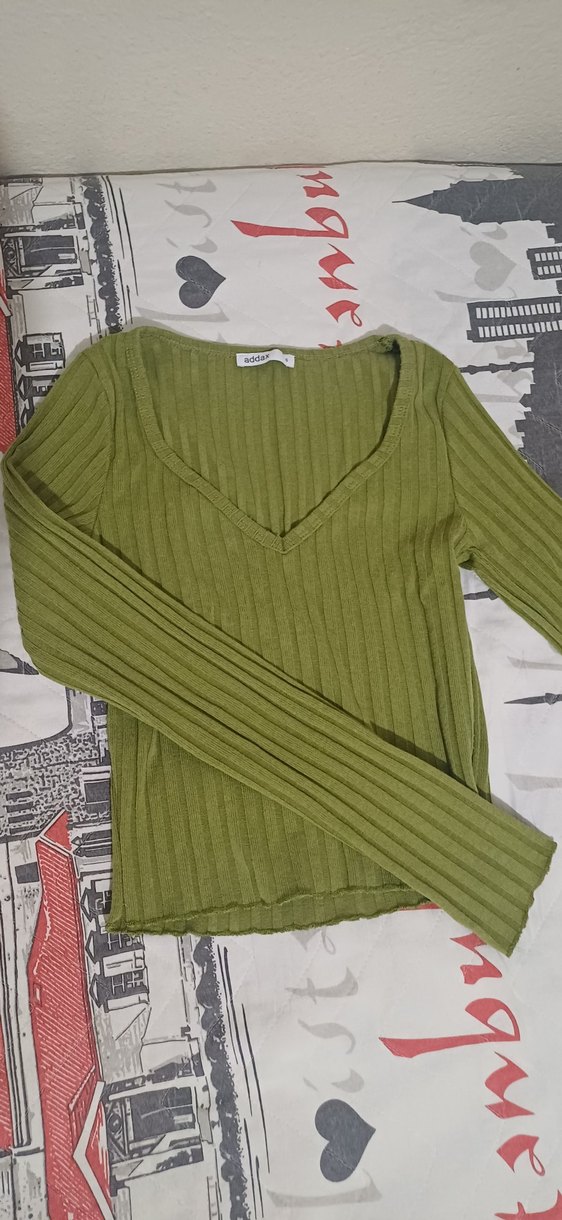 Yeşil renkli, kalp yakalı, fitilli kadın hafif crop bluz. Uzun kollu günlük kullanıma uygundur.