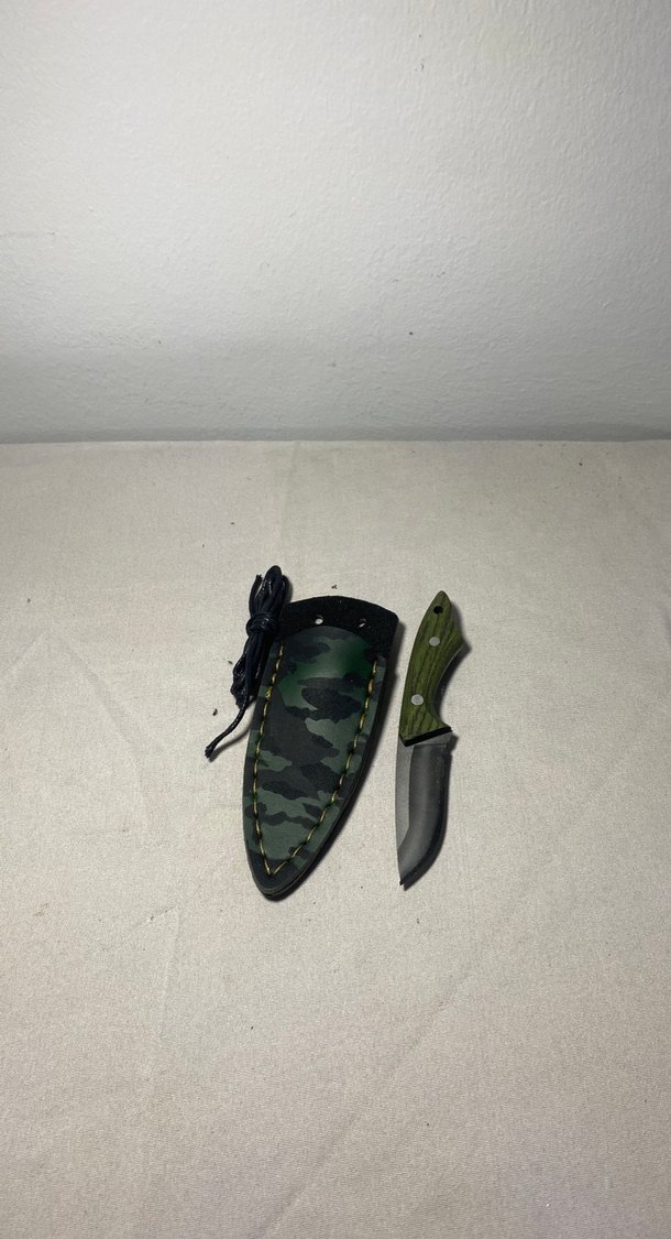 Yeşil saplı küçük bıçak ve kamuflaj desenli, kayışlı kılıf seti. Bıçağın kavisli bıçağı ve dokulu sapı vardır. Paduk Kabze mini kolye bıçak