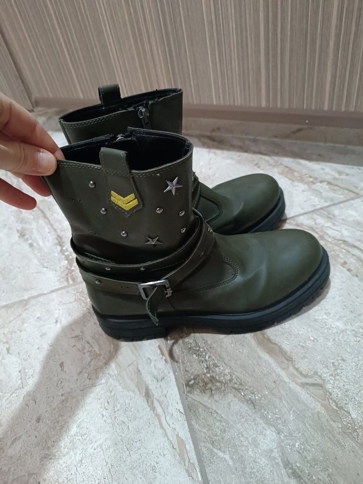 Yeşil kamuflaj desenli kadın deri bot, kama topuklu ve tokalıdır. Günlük kullanıma uygun rock punk tarzında, çivili detaylara sahiptir.