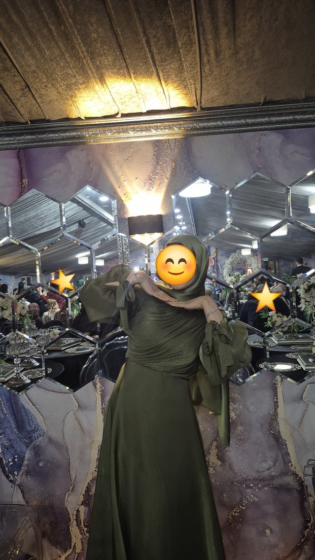 Yeşil renkte, kamuflaj desenli, uzun ve drapeli, bol kesim elbise. Balıkçı yaka ve uzun kolludur, sentetik kumaştan yapılmıştır, mütevazı parti kıyafeti için uygundur.