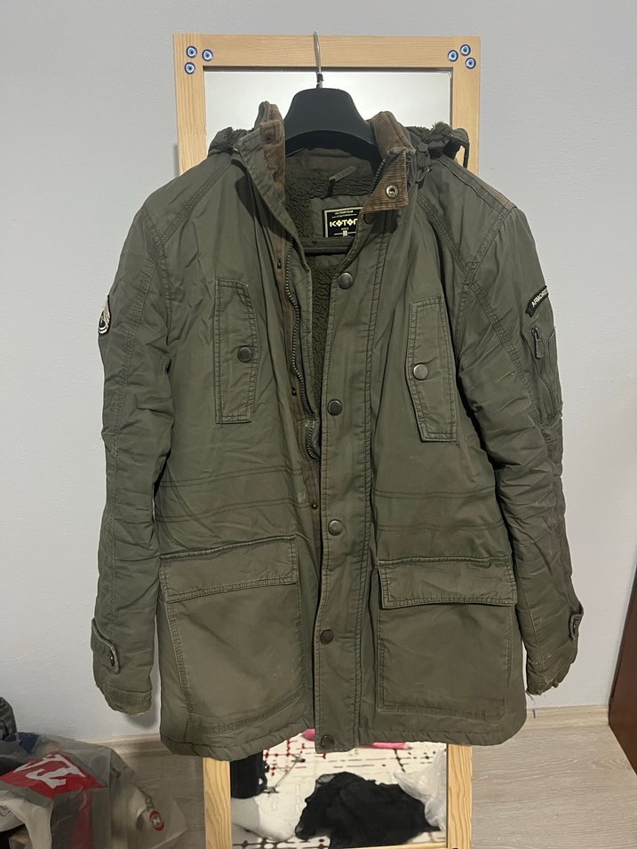 Düğmeli, yeşil kamuflaj desenli erkek mont. Bol kesim, çıtçıtlı, yakası kesik, uzun kollu ve içi yumuşak kumaşla kaplıdır. Günlük kullanım için uygundur. Sadece kollarında bir kaç sorun var görseldeki gibi