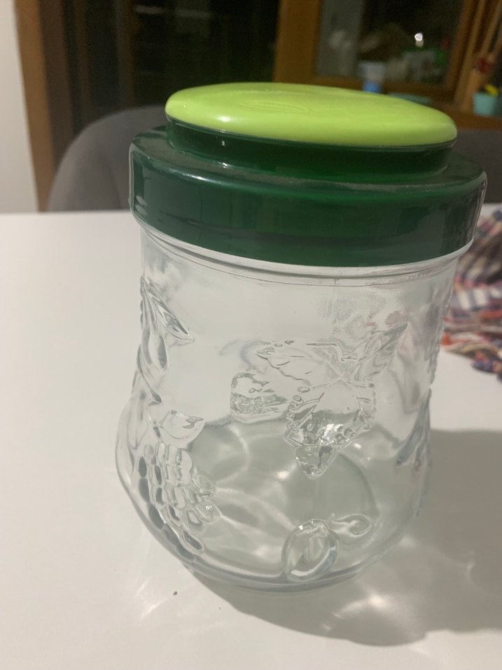Renkli yeşil kapaklı, kabartmalı desenlere sahip kavanoz .23 cm yüksekliğidir .