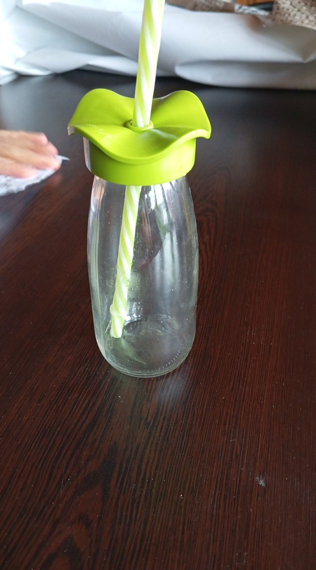 Yeşil kapaklı, renkli çizgili pipetli ve şeffaf cam gövdeli bebek biberonu. Kolay içim ve temizlik sağlar.