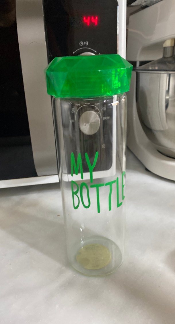 Renkli yeşil kapaklı, üzerinde " MY BOTTLE bez kılıfında CAM SULUK