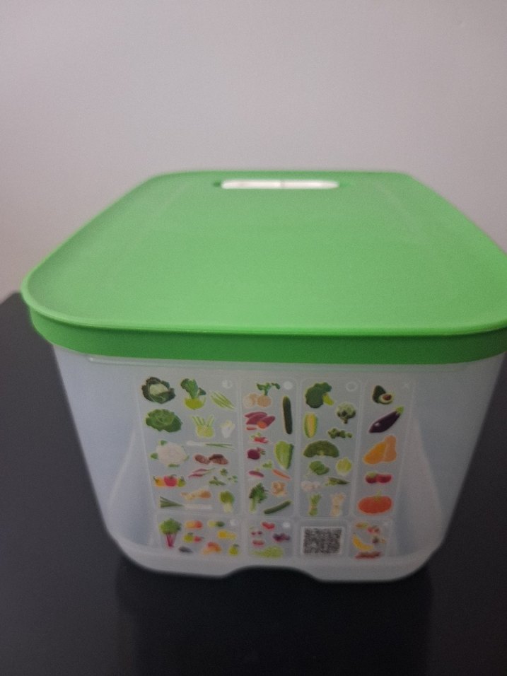 Yeşil kapaklı, yan tarafında sebze resimleri bulunan şeffaf plastik saklama kabı. 4,4 lt