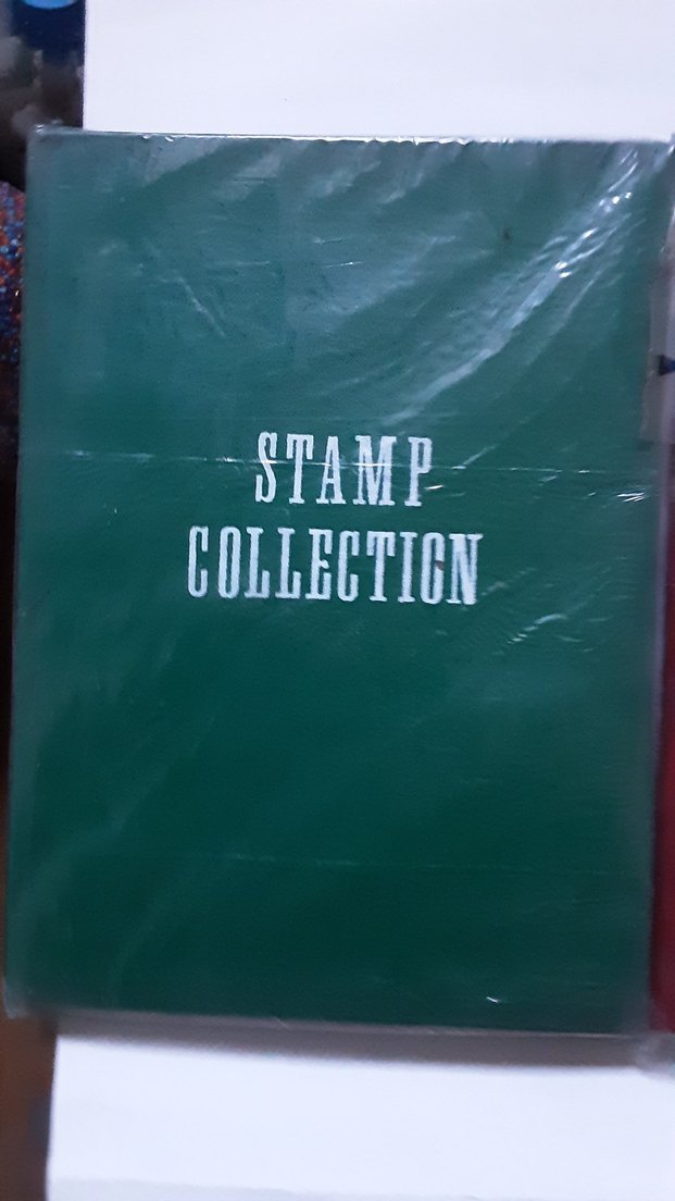 Yeşil kapaklı 'Stamp Collection' yazılı pul koleksiyon defteri, pulları düzenli şekilde saklamak için kullanılır.