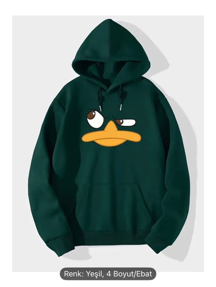 Yeşil kapüşonlu sweatshirt, baskılı karikatür yüz detaylıdır. Uzun kollu, bol kesim ve yumuşak polar kumaştandır. M L XL XXL BULUNUR