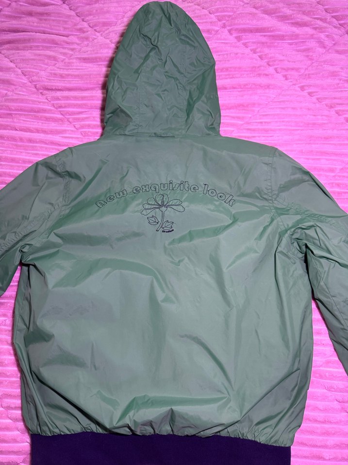çift taraflı yeşil, kapüşonlu ve fermuarlı, ince kesim bir ceket. Düz, pastel tonlu sentetik kumaştan üretilmiş ve sırtında ince nakış detayı bulunur. Rahat sokak stili için uygun. Fiyatta indirim yapabilirim.