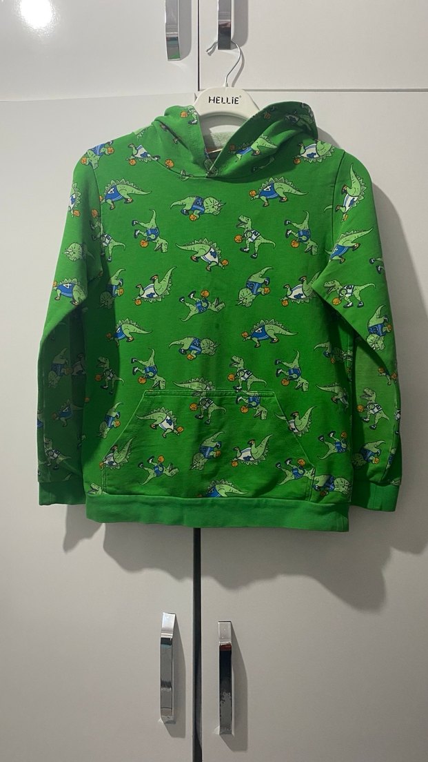 Renkli dinozor baskılı yeşil kapüşonlu erkek çocuk sweatshirtü, örgü uzun kollu ve bol kesimdir. Kumaşı yumuşak ve sıcaktır.