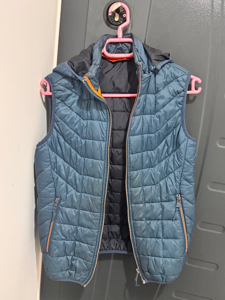 Gri renkte, kapüşonlu ve fermuarlı cepli erkek şişme yelek. Hafif sentetik kumaştan, günlük ve sokak stiline uygun dar kesim.