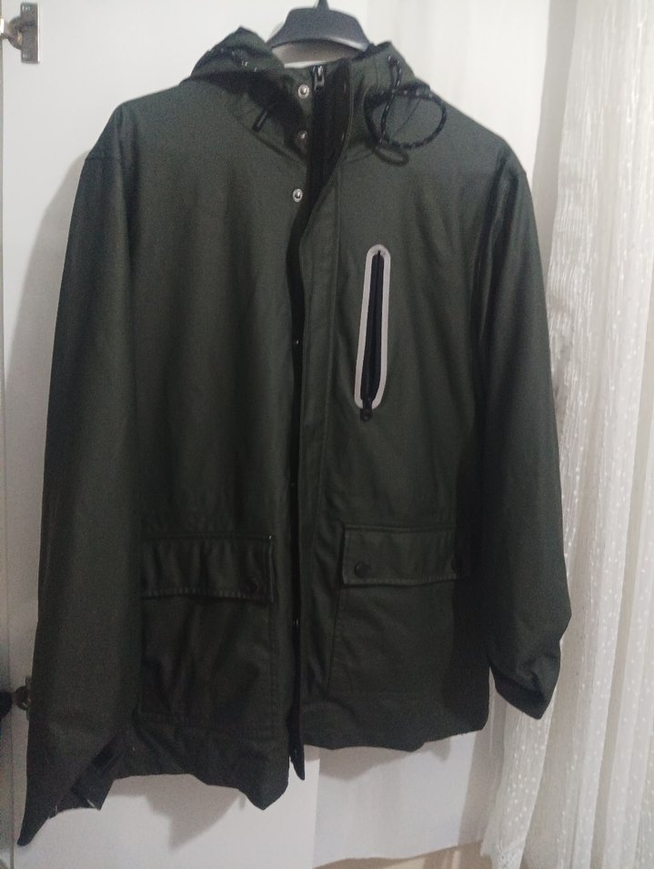 Koyu yeşil renkte, fermuarlı, kapüşonlu ve kesik yaka detaylı erkek montu. Sentetik kumaştan, uzun kollu ve midi boyda, rahat kesim outdoor kullanıma uygun.