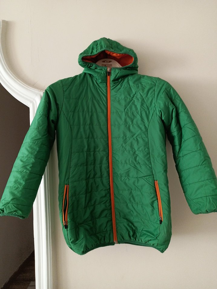 Yeşil parlak renkte, kapüşonlu, fermuarlı cepleri olan, ince ve sıcak tutan kumaştan erkek çocuk montu. Sokak stili sade tasarım.