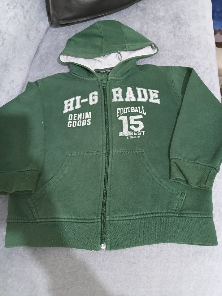 Yeşil kapüşonlu, fermuarlı erkek sweatshirt, uzun kollu ve baskılı futbol temalı yazılar içerir. Yumuşak ve sıcak kumaştan, ön cepli ve fitted kesim, streetwear tarzında.