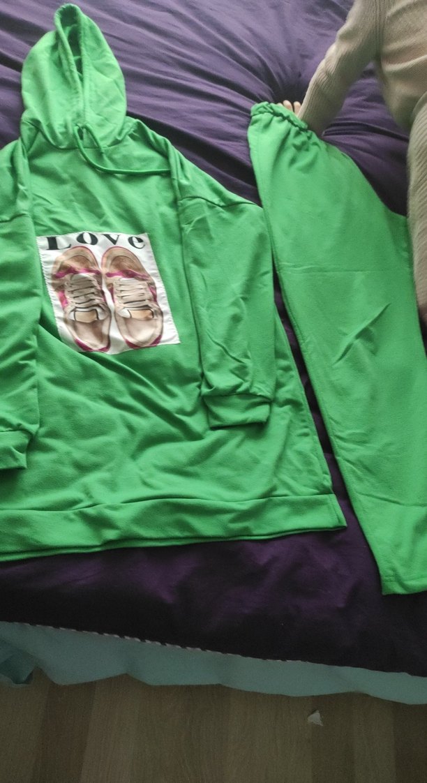Kadınlar için uzun kollu, kapüşonlu ve renkli baskılı tasarıma sahip yeşil eşofman takımı. Velcro detaylı, bol kesim ve uzun boyludur, sentetik kumaştan üretilmiştir.