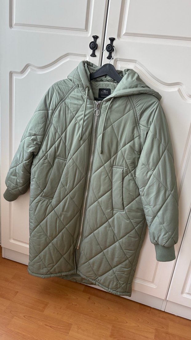 Yeşil kapüşonlu, kadın kışlık mont. Fermuarlı, yumuşak ve sıcak kumaştan, rahat kesim ve uzun kollu, sokak stiline uygun. Kalıbı çok geniş m beden giyiyorum s bedene sahip mavi markasına ait yepyeni çok temiz kullanıldı bir kaç kez giyilmiştir