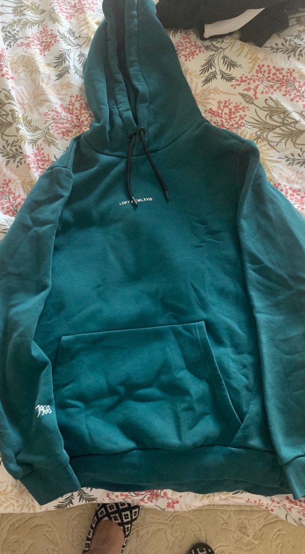 Koyu yeşil renkli, bol kesim ve normal boyda, uzun kollu, kapüşonlu kadın sweatshirt. Ön cepli, yumuşak ve sıcak kumaştan, günlük kullanıma uygun. Orijinal ürün çok az kullanıldı hiç bir kusuru yoktur