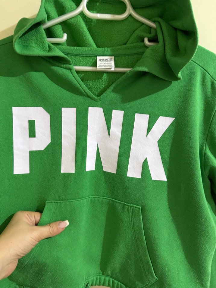 Yeşil kapüşonlu kadın sweatshirt, uzun kollu ve ön cep detaylıdır. "PINK" baskılı, yumuşak ve sıcak kumaştan, fit kesimdir. Spor ve günlük kullanıma uygundur.