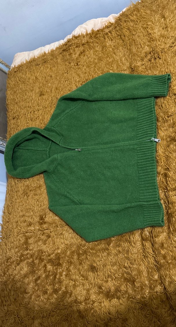 Kore’den aldım, Yeşil renkli, kapüşonlu ve fermuarlı, uzun kollu triko sweatshirt yün kazak . Yumuşak ve sıcak dokusu ile günlük rahat kullanıma uygundur.