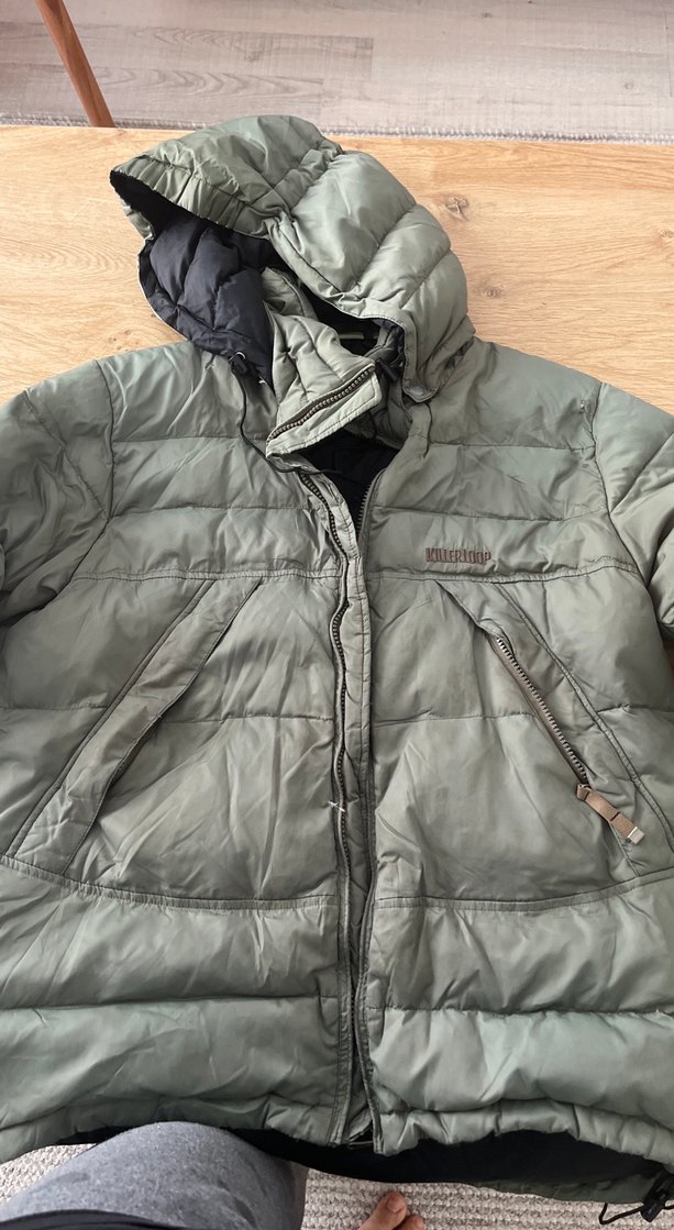 Yeşil kapüşonlu ve fermuarlı erkek kışlık mont. Yumuşak ve sıcak kumaştan, midi boy ve dar kesimdir. Outdoor kullanıma uygundur. Omuz kısmında yırtık var ufak