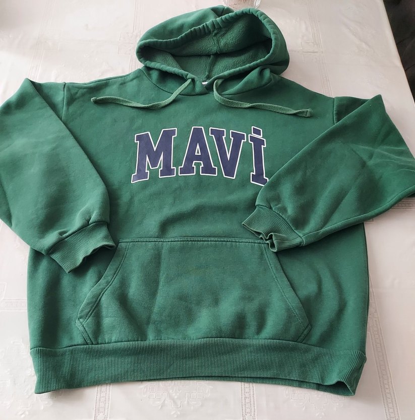 Yeşil kapüşonlu, bol kesim ve uzun kollu sweatshirt. "MAVI" baskılı, yumuşak ve sıcak kumaştan, spor tarzı için uygundur. ♀️