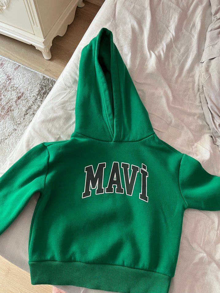 Yeşil kapüşonlu, uzun kollu ve fermuarlı sweatshirt. Üzerinde "MAVI" baskısı bulunur. Yumuşak, sıcak kumaştan, normal boyda ve dar kesimlidir. 5-6yaş