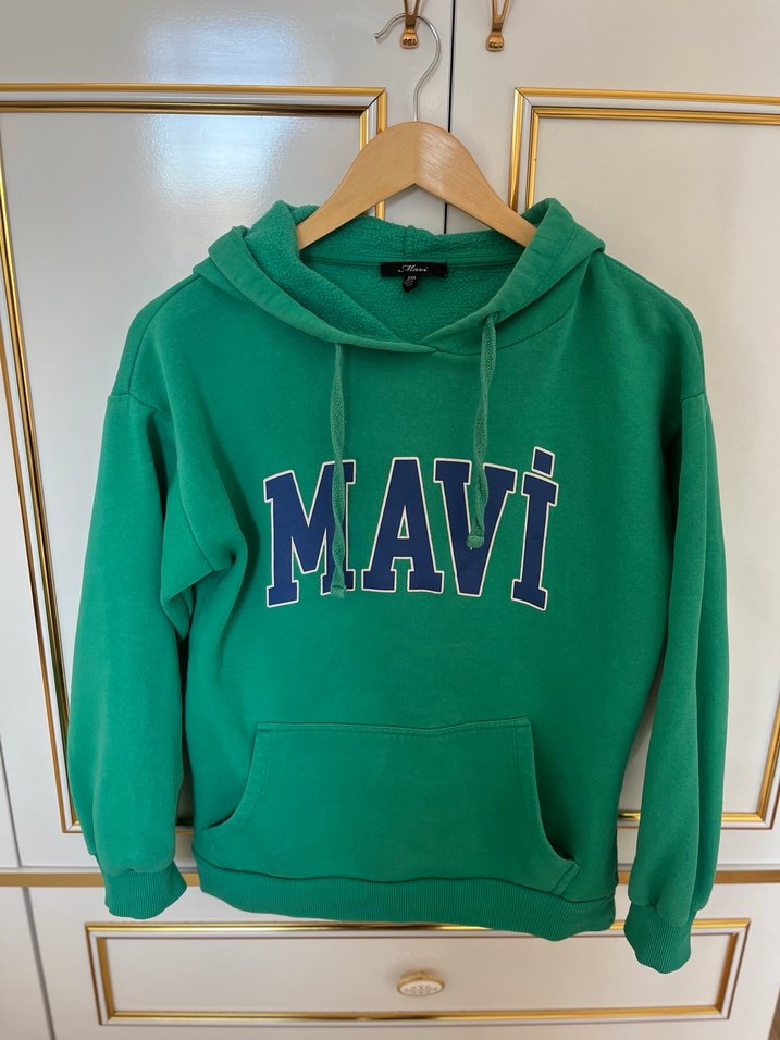 Yeşil renkte, kapüşonlu ve uzun kollu MAVİ baskılı sweatshirt. Yumuşak tüylü kumaştan, bol kesim ve örme detaylıdır. Rahat ve günlük kullanıma uygundur. Xs beden s m içinde uygun şapka altına gelen kısımda leke gibi bişey var katlandığından bellimoşmjyor zaten haricinde sorunu yok yeni gibi 2 kez giydim pek kullanmıyorum görseldeki gibi koyu yeşil tonunda