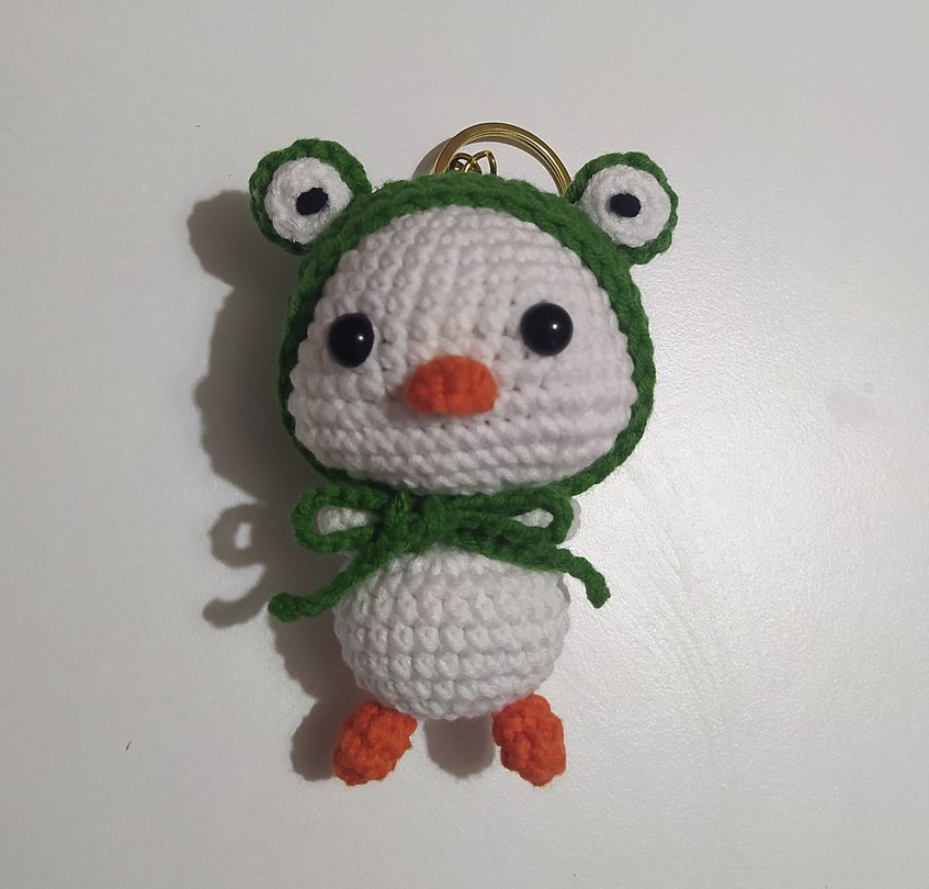 Yeşil kapüşonlu, turuncu ayaklı ve siyah gözlü beyaz örgü peluş anahtarlık. 10 cm Koton iple elde örüldü.