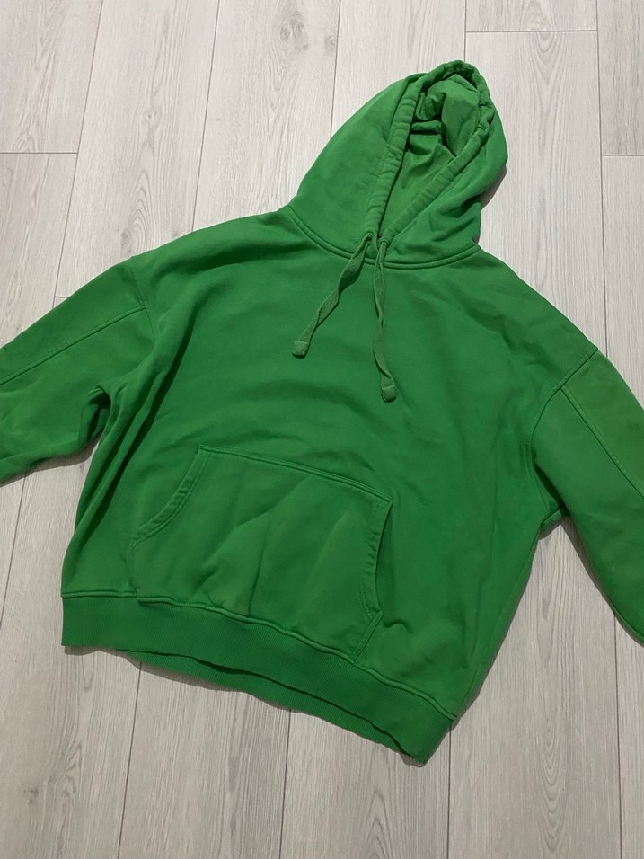 Yumuşak ve sıcak kumaştan, kapüşonlu, uzun kollu, rahat kesim yeşil sweatshirt. Ön cebine sahiptir, günlük kullanım için uygundur.
