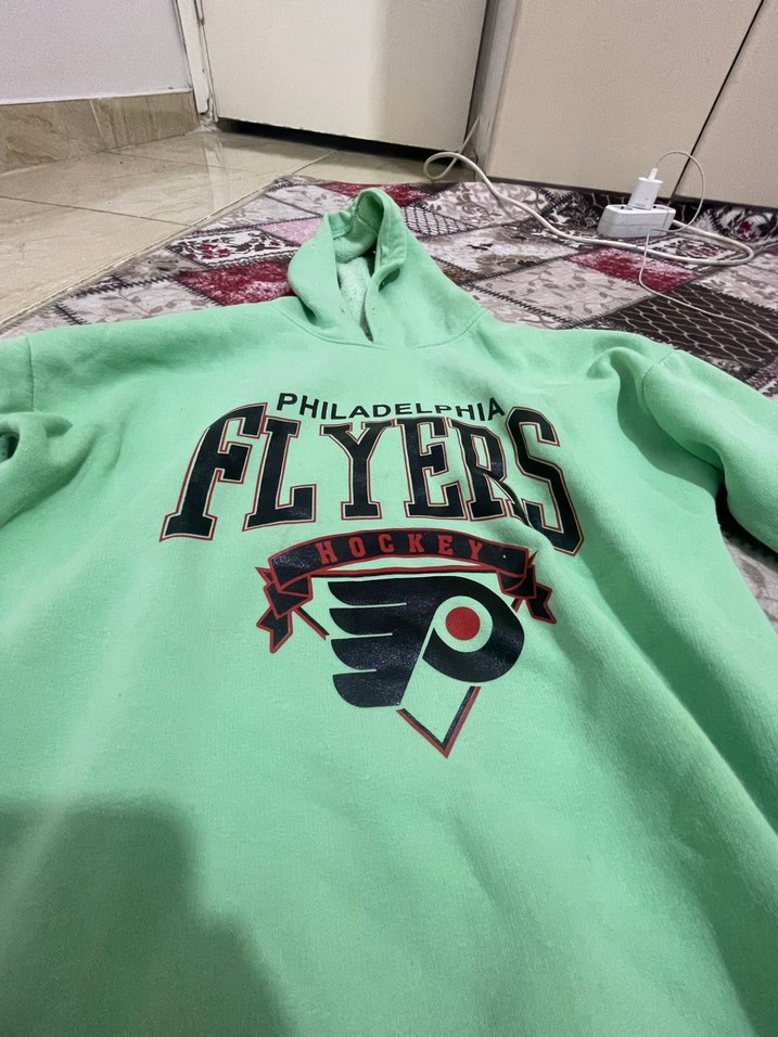 Yeşil kapüşonlu sweatshirt, uzun kollu ve fermuarlı. Renkli Philadelphia Flyers baskılı, yumuşak ve sıcak kumaştan, spor ve sokak stiline uygun.