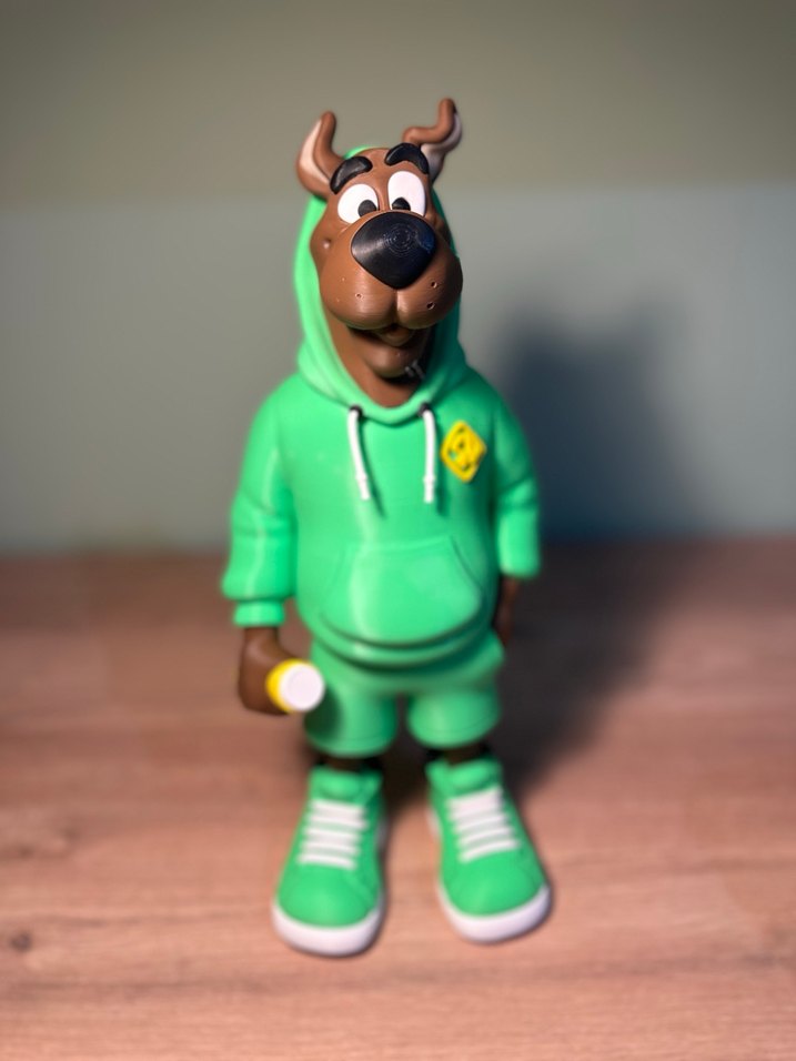 Yeşil kapüşonlu ve spor ayakkabılı Scooby-Doo figürü, elinde küçük beyaz bir nesne tutuyor. 33 cm boyunda kendi 3D basımım