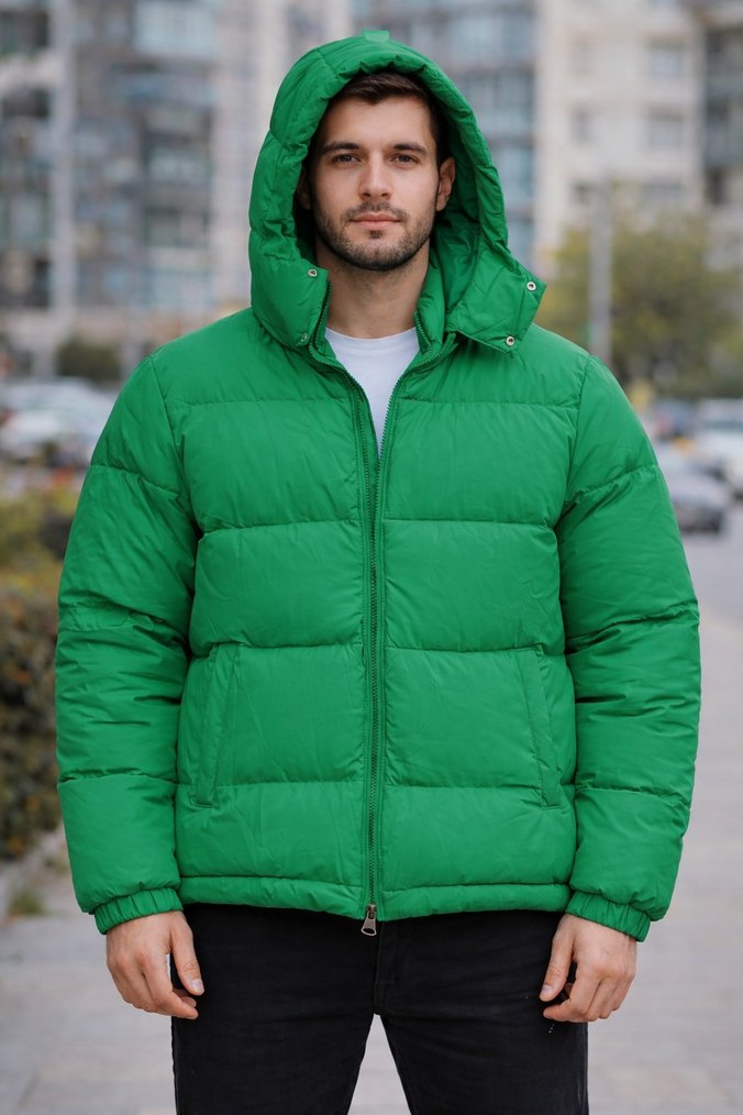 Yeşil Kapüşonlu Şişme Erkek Mont