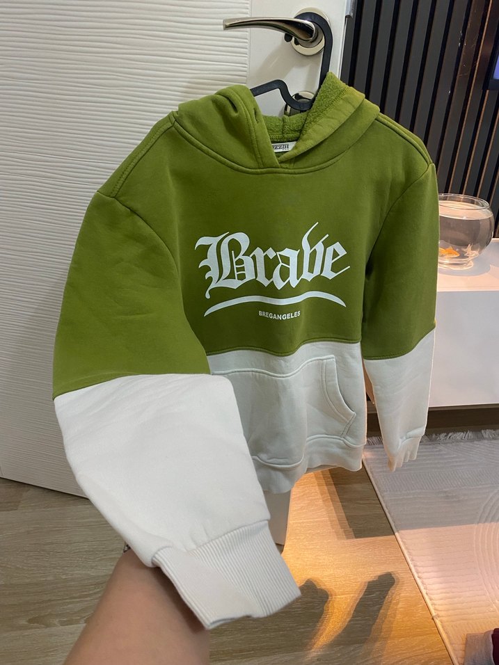 Yeşil renkli, bol kesim, uzun kollu ve bisiklet yaka sweatshirt. Örgü dokusu ve 'Brabe' baskılı tasarımı vardır. Canlı gri ve beyaz renk bloklarıyla, yumuşak ve sıcak kumaştan üretilmiştir.