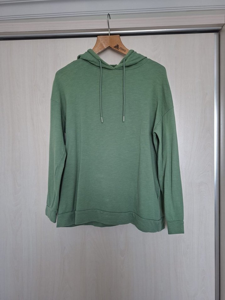 Yeşil renkli, uzun kollu ve kapüşonlu kadın sweatshirtü, rahat kesimi ve yumuşak kumaşıyla günlük kullanıma uygundur.